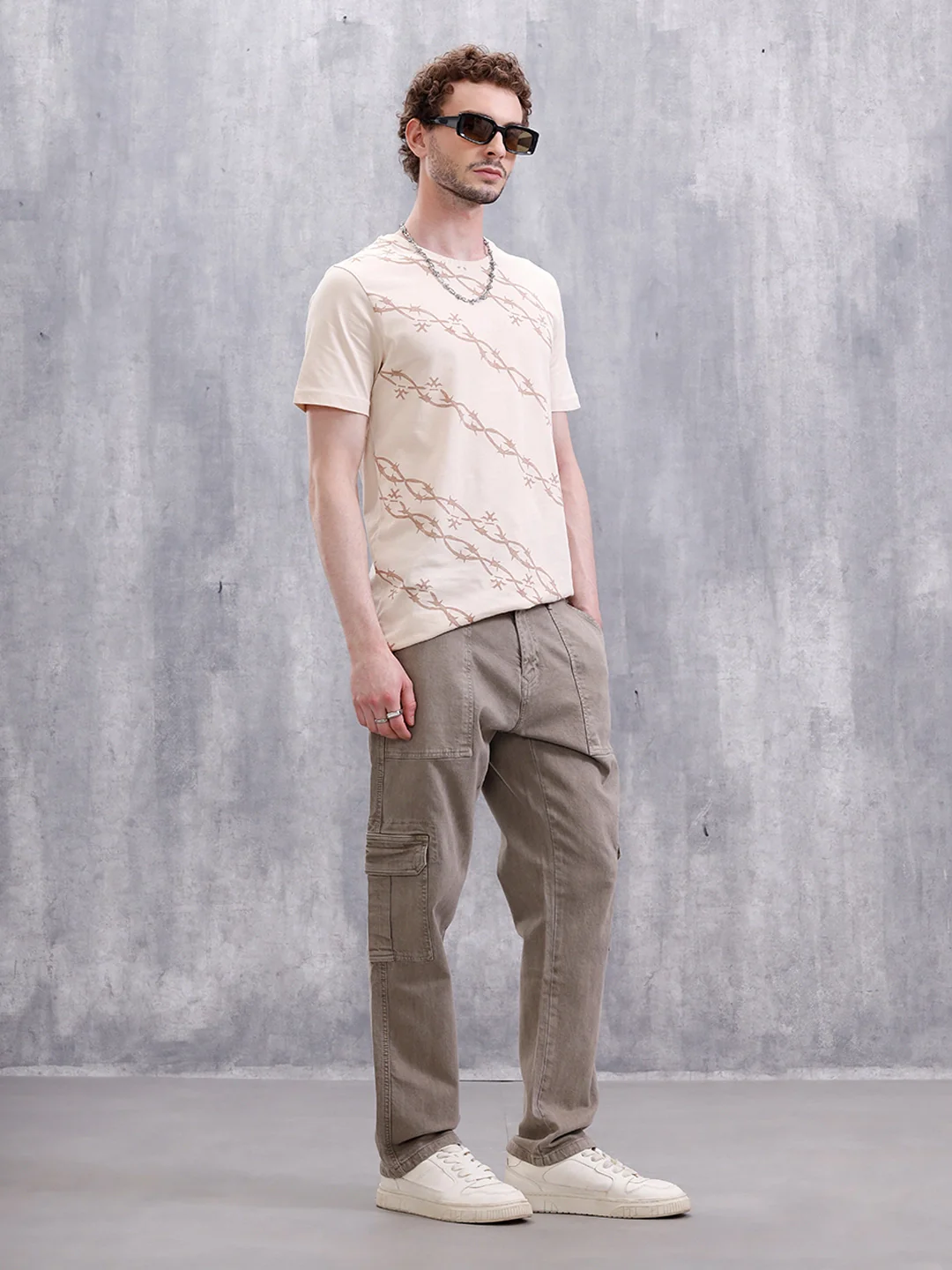 Rugged by design, refined in fit. This beige tee features an all-over barbed wire print that brings rebellious energy without compromising on comfort. The slim silhouette hugs just right, while the soft fabric lets you wear that edge all day.
