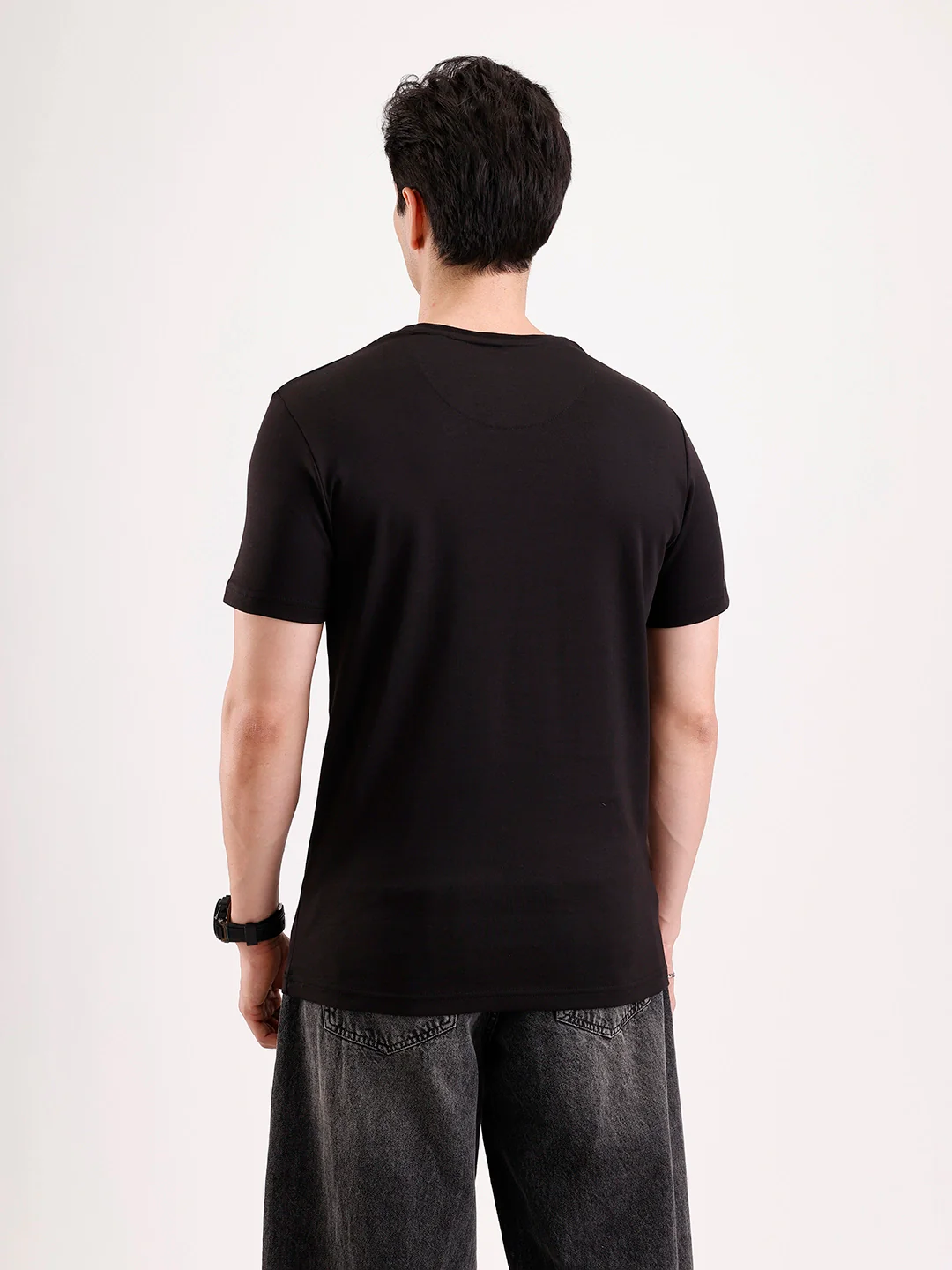 This black T-shirt features a soft flock print that adds subtle texture. Designed with a classic fit for everyday comfort. The breathable fabric ensures ease throughout the day. A refined essential for casual styling.